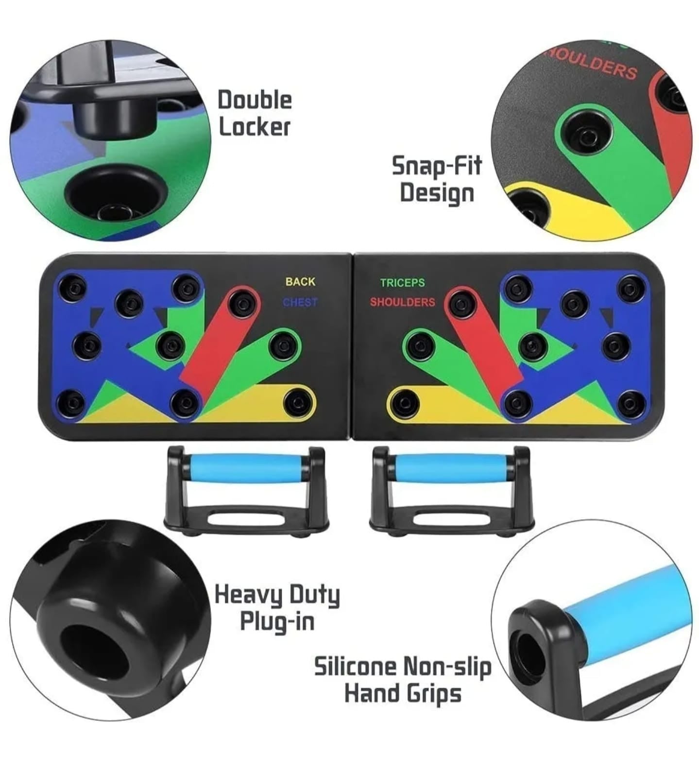 ¡Transforma tus rutinas de entrenamiento en casa! La Tabla Base de Entrenamiento para Flexiones es un sistema práctico y multifuncional que te permite trabajar diferentes grupos musculares gracias a su diseño con agarres antideslizantes ajustables. Con solo cambiar la posición de los mangos, puedes enfocar el trabajo en pecho, espalda, tríceps y hombros sin necesidad de ir al gimnasio.